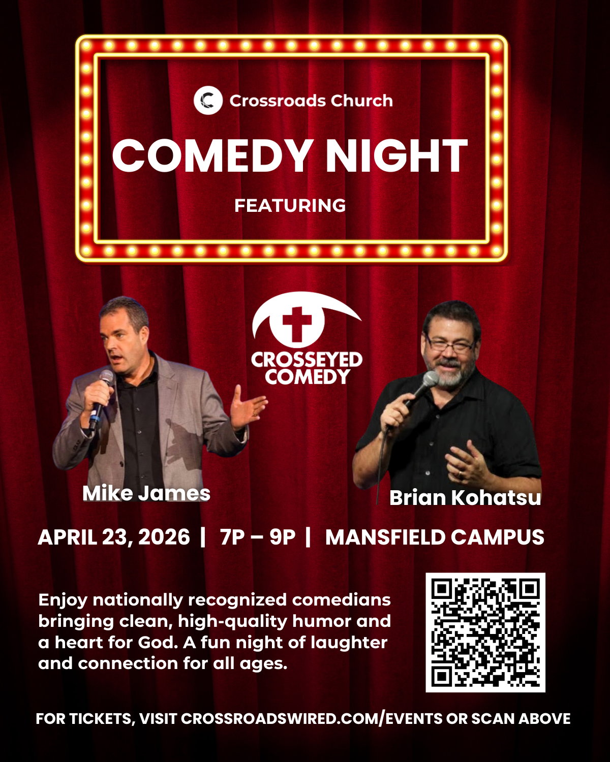 Start the new year with some joy! Crosseyed Comedy is coming to Crossroads with a lineup of nationally recognized comedians who bring clean, high-quality humor with a heart for God. You’ve seen them on Late Night TV, Amazon, and heard them on the radio — now experience them live for a night of laughter, connection, and fun for all ages.