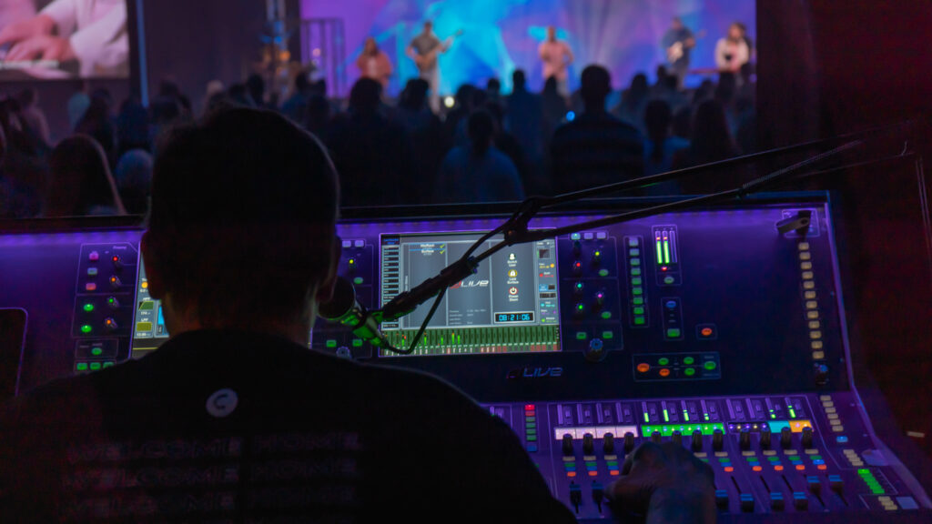 This team controls the video playback, lyrics, message graphics, and countdown timers during our services.